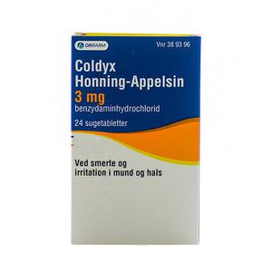 Coldyx sugetabletter med smagen af honning og appelsin symptombhandler smerter og irritation i mund og svælgColdyx er et smertestillende håndkøbslægemiddel som avendes lokalt i mund og svælg. Det aktive lægemiddelstof er Benzydamin. Anvendelse og virkning (Læs mere)