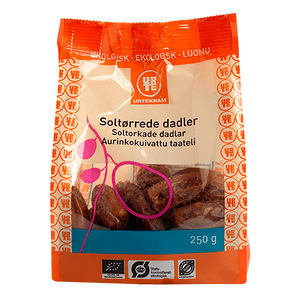 Urtekram Soltørrede dadler snacks Ø – 250 gSoltørrede og skånsomt rehydrede for at bevare saftigheden. Udstenede, men enkelte hårde partikler kan forekomme. Spis dem som snack eller lav lækkert ymerdrys med hakkede dadler og nødder blandet med fuldkornsfl (Læs mere)